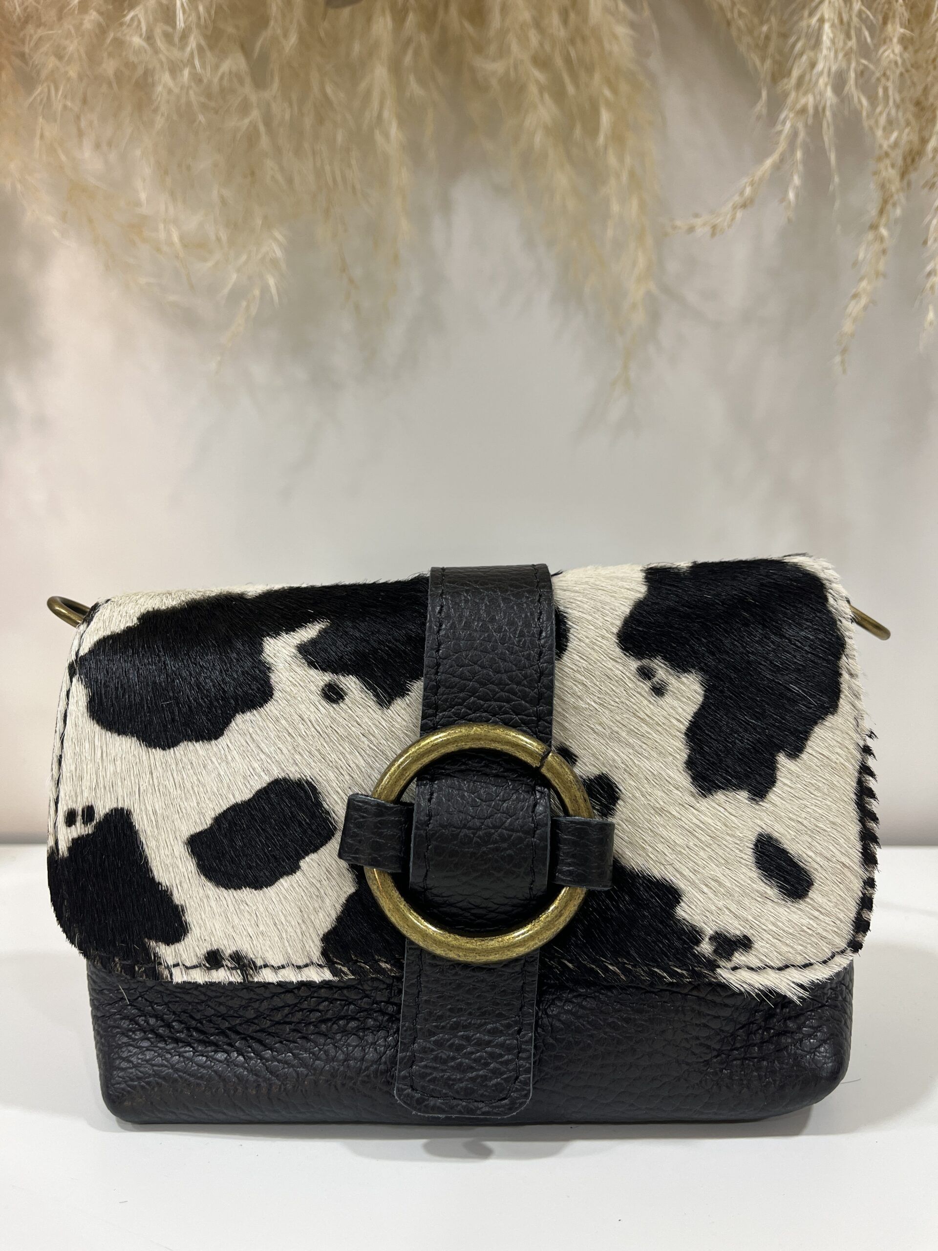composicion : piel y tapeta de pelo medidas : altura 12 cm / ancho 19 cm color : negro y crudo bolso de piel mini con tapeta y tirante de cadena largo en su interior.