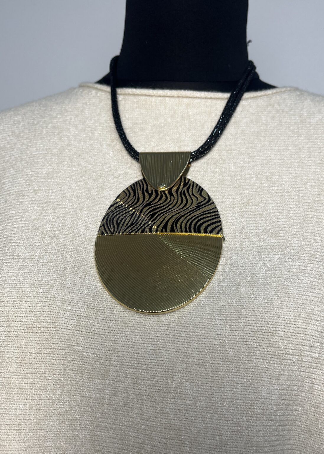 Collar corto de cordón metalizado con centro oval en metal tex turado y estampado animal. en color: dorado y negro.  Composición: poliéster. PU. metal.