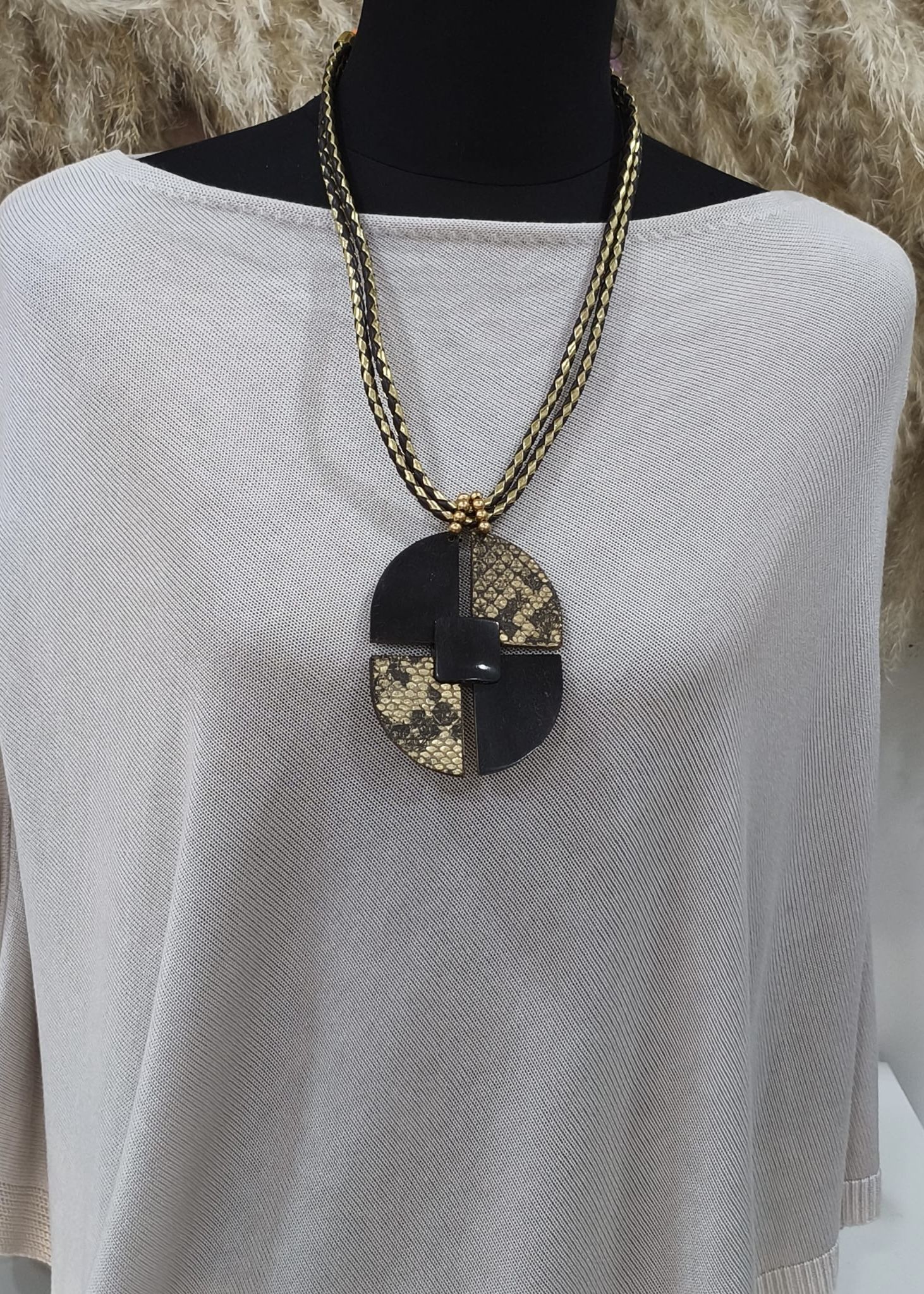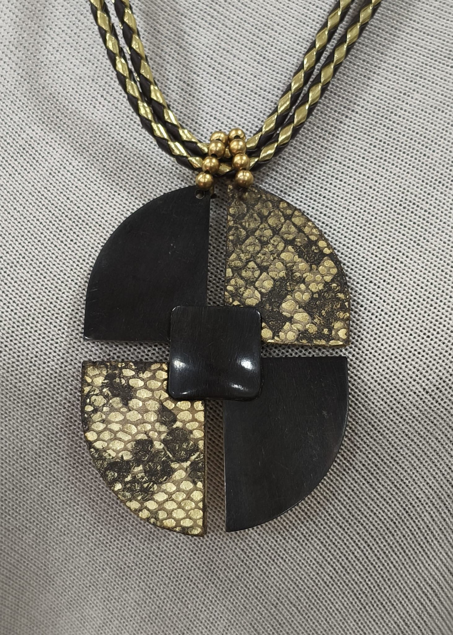 Collar en cordón trenzado en piel. con centro en cuatro piezas de asta. resina y acabado piel de serpiente. en un color: tonos tierra. negro y dorado sutil.  Composición: piel. asta. resina.cordón. metal.